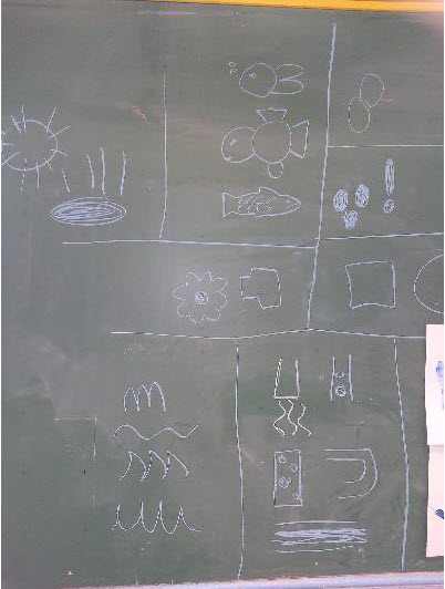 Avec des feutres, ils ont dessiné leur propre représentation d’une fontaine puis ont identifié différents pictogrammes dans leurs dessins (gouttes, robinets, vague, poissons..) et les ont reproduits au feutre: