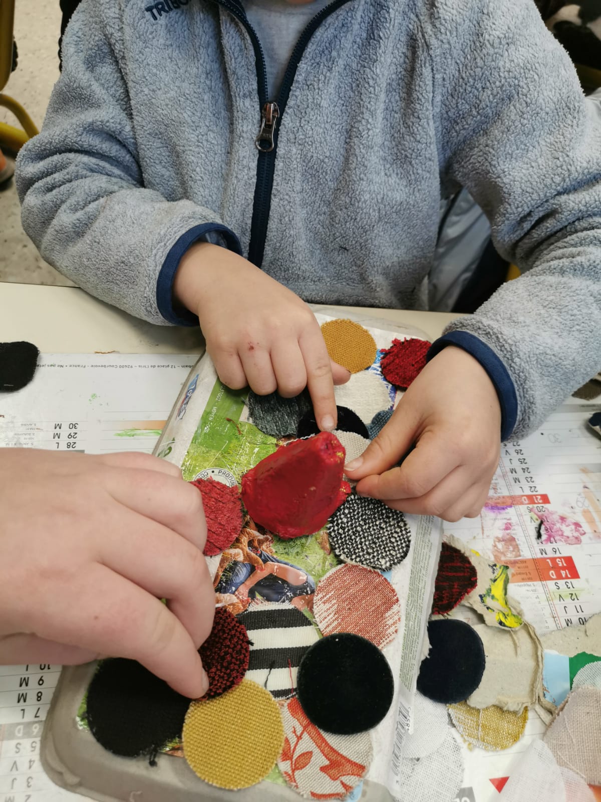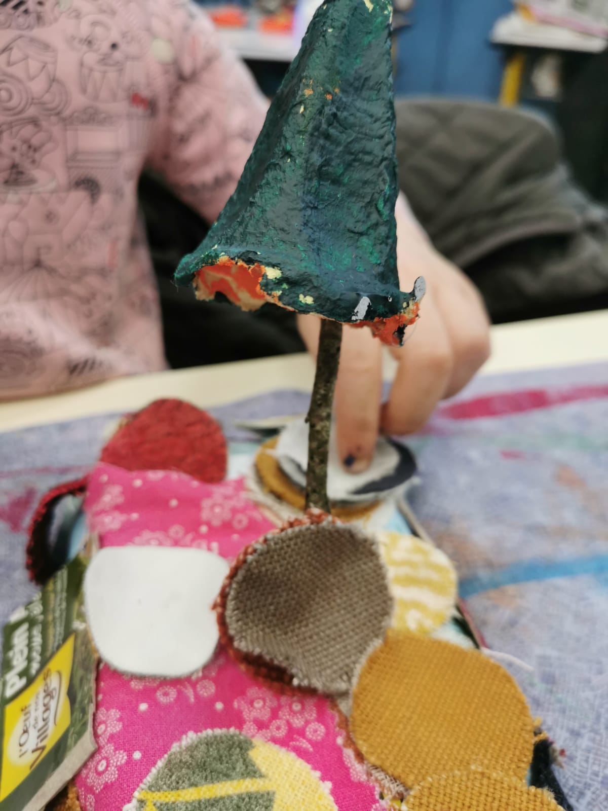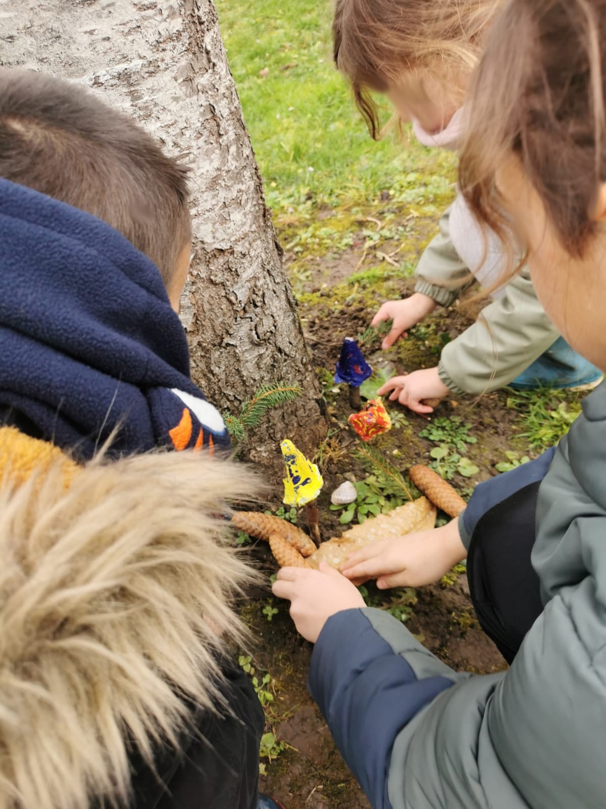 – créer un petit monde avec ce qui a été ramassé dans le bois ; création de petits champignons avec des boîtes d’œufs en papier recyclé et peinture acrylique.