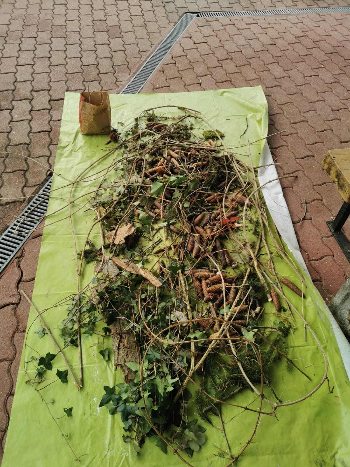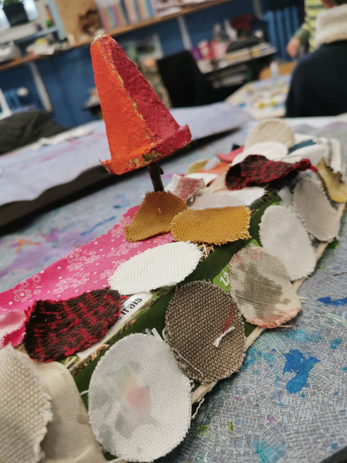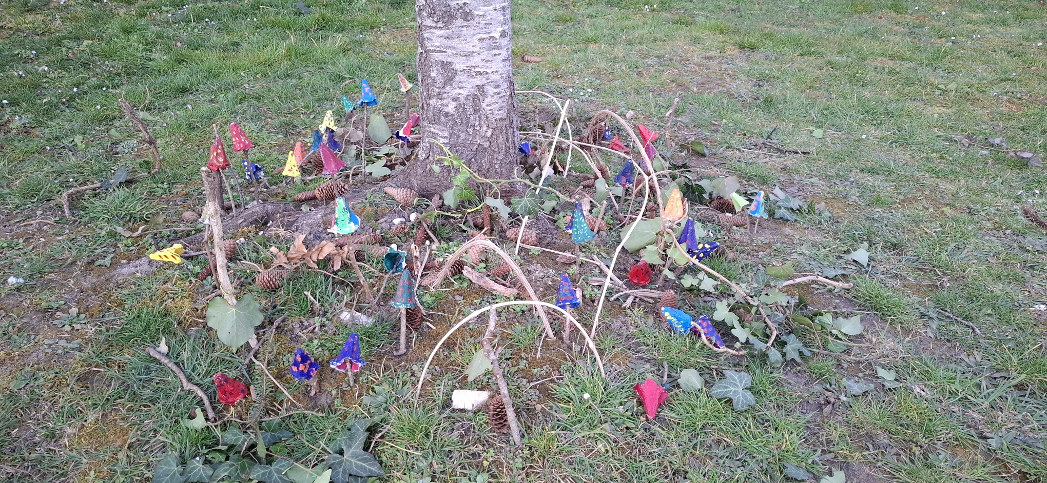 – créer un petit monde avec ce qui a été ramassé dans le bois ; création de petits champignons avec des boîtes d’œufs en papier recyclé et peinture acrylique.